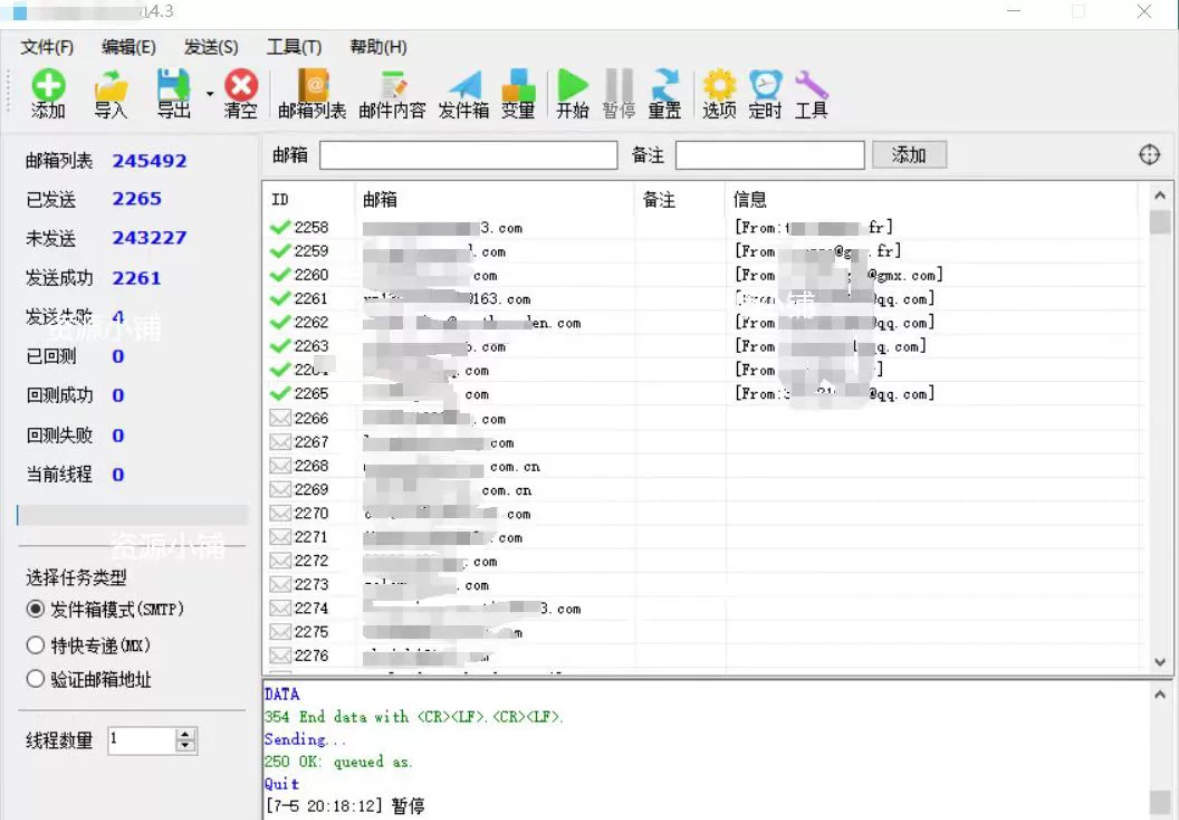 『引流必备』最新版STMP协议邮箱群发器 项目介绍:支持QQ 163 等邮箱添加发送,可以设置变量,设置发送时间,发件人信息,定时等,各种丰富功能设备需求:电脑软件图: 赏 您可以选择一种方式赞助本站 支付宝转账赞助 支付宝扫一扫赞助 支付宝钱包扫描赞助